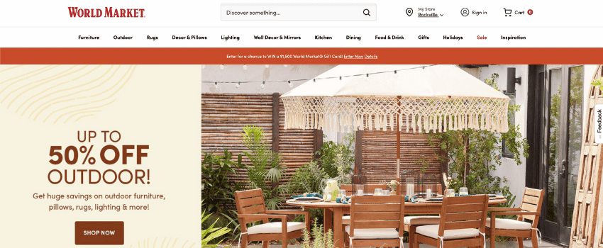 - Free shipping: on selected offers and via World Market Rewards