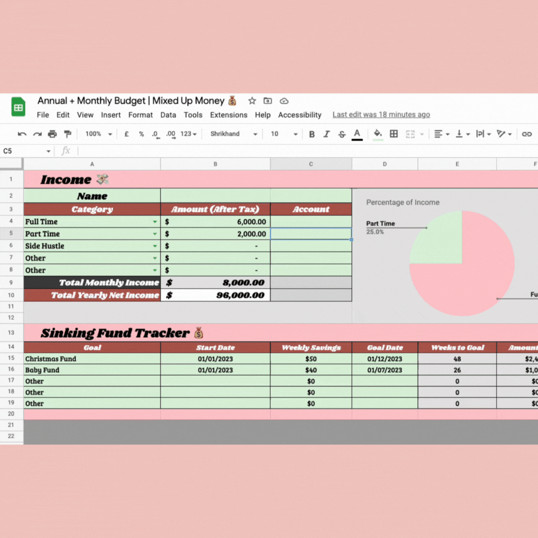 A monthly and annual Google Sheets budget template to help manage your spending and savings goals.